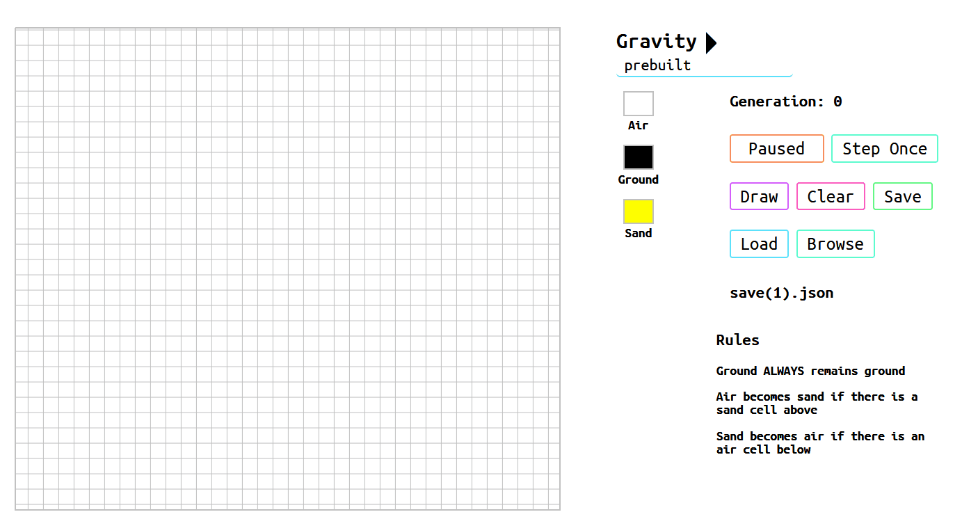 I’ve come back to this project a couple times since finshing it to try writing some custom rules. I’ve been amazed at how easy it is to create completely new simluations by adding 2 or 3 lines of code to a save file. I was able to quickly simulate gravity by having a “sand” cell move downwards till it reaches a ground or sand cell.