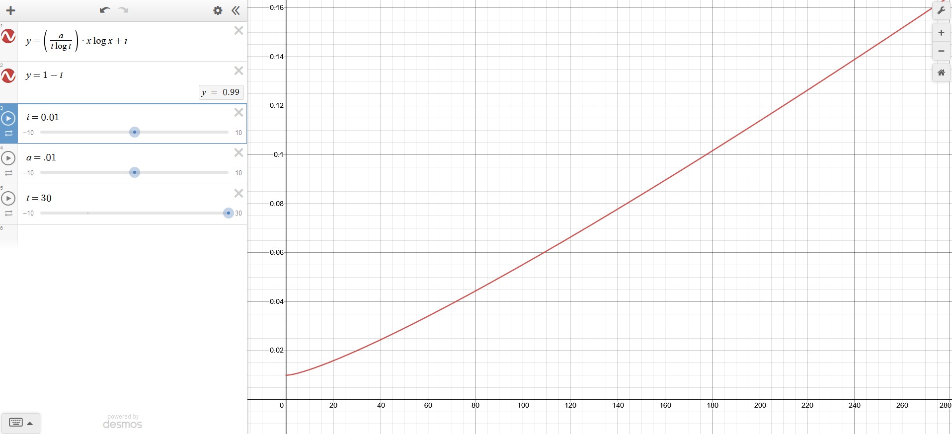 Each frame, a randomly generated number (from 0 to 1) is compared to the shown curve. If it is below the curve, it would spawn an enemy. The parameters i, a, and t correspond to the inital spawnrate, target spawnrate, and target time, respectively. I utilized these parameters to easily adjust the difficulty of the game.
