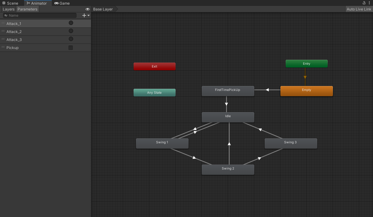 One of the more challenging features that forced me to clean up the Player’s animator was the ability to combo melee attacks. There were 3 different animation clips (each for a different type of swing) that needed to be depending on the length of time since the last swing. My initial efforts to track the time spent in each state and since state changes created a complicated mess of edge cases that broke the animations.