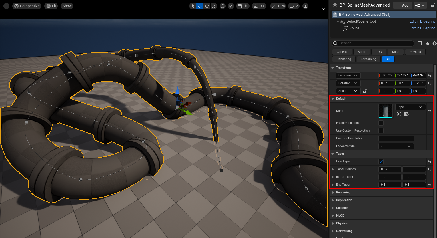 Our Lead Artist, Ben Cressman, and I collaborated on a more advanced version of Unreal’s Spline Mesh. My end result is a blueprint that creates a variable amount of static mesh components along a spline with a simplified tapering system.